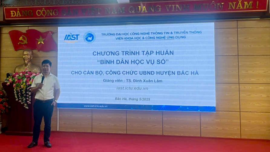 Trong bối cảnh cách mạng công nghiệp 4.0 đang diễn ra mạnh mẽ, chuyển đổi số không còn là khái niệm xa vời, mà trở thành yếu tố quyết định để nâng cao hiệu quả quản lý nhà nước, đặc biệt tại các địa phương vùng cao. Nhận thức rõ tầm quan trọng đó, Viện Khoa học và Công nghệ Ứng dụng (IAST) – Trường Đại học Công nghệ Thông tin và Truyền thông Thái Nguyên đã phối hợp cùng UBND xã Bắc Hà tổ chức chương trình tập huấn “Bình dân học vụ số” vào ngày 28–29/05.