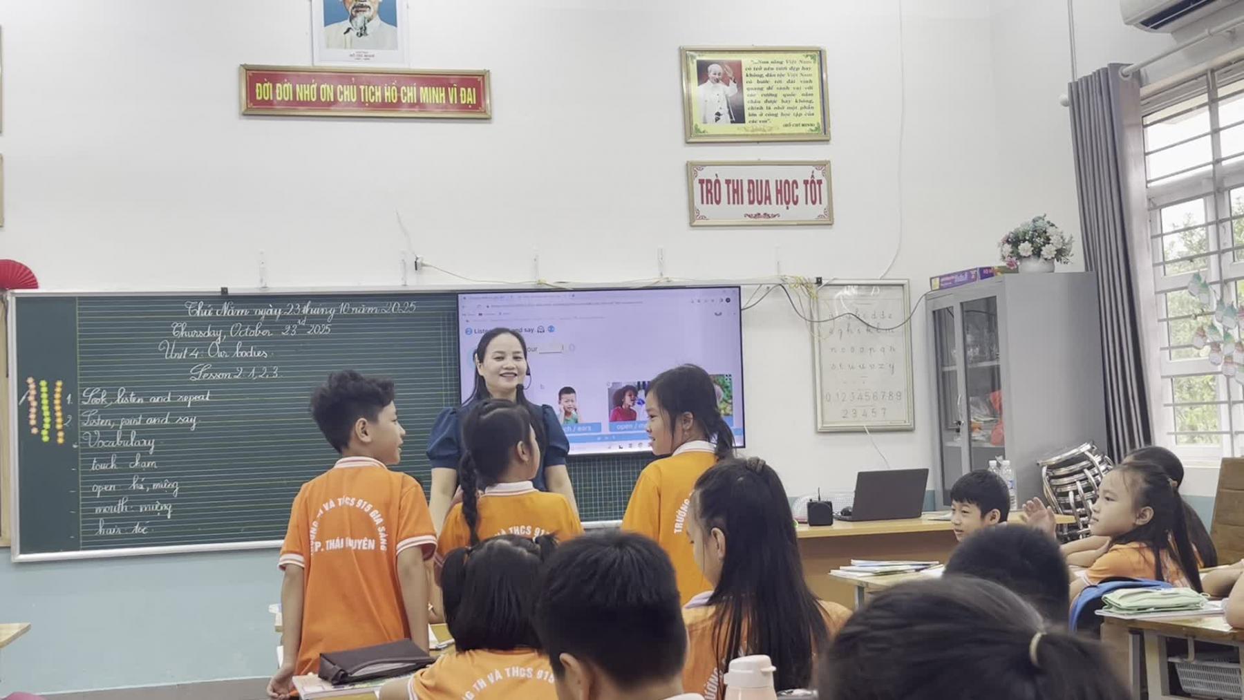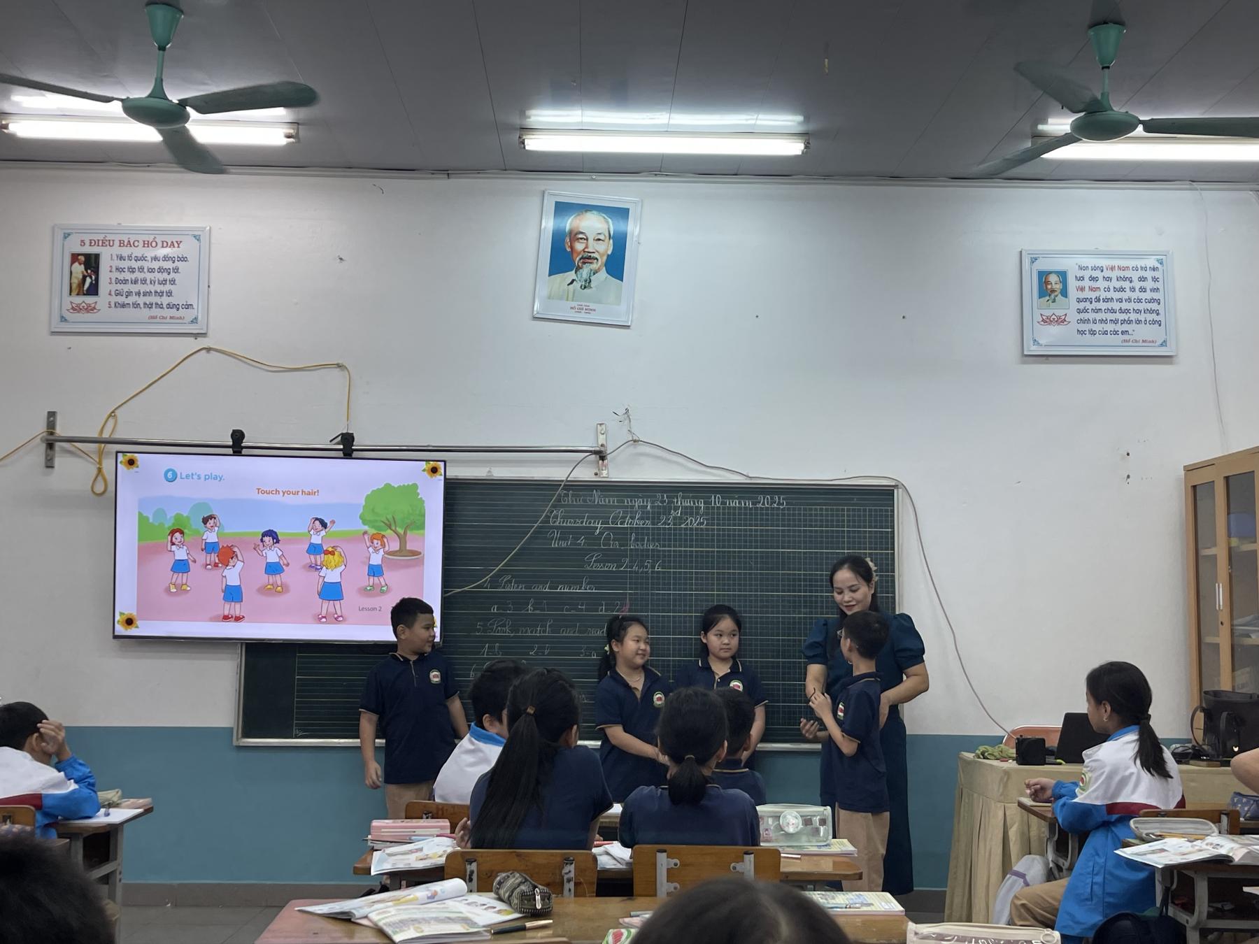 Ở khối lớp 3, tiết học tiếng Anh diễn ra trong không khí sôi nổi, nhiều tương tác và giàu yếu tố trực quan. Phương pháp giảng dạy chủ yếu tập trung vào việc hình thành hứng thú học tập thông qua hình ảnh, trò chơi, bài hát và các hoạt động vận động nhẹ. Giáo viên đóng vai trò trung tâm trong việc dẫn dắt, khơi gợi phản xạ nghe – nói cho học sinh, giúp các em làm quen với ngôn ngữ mới một cách tự nhiên.
