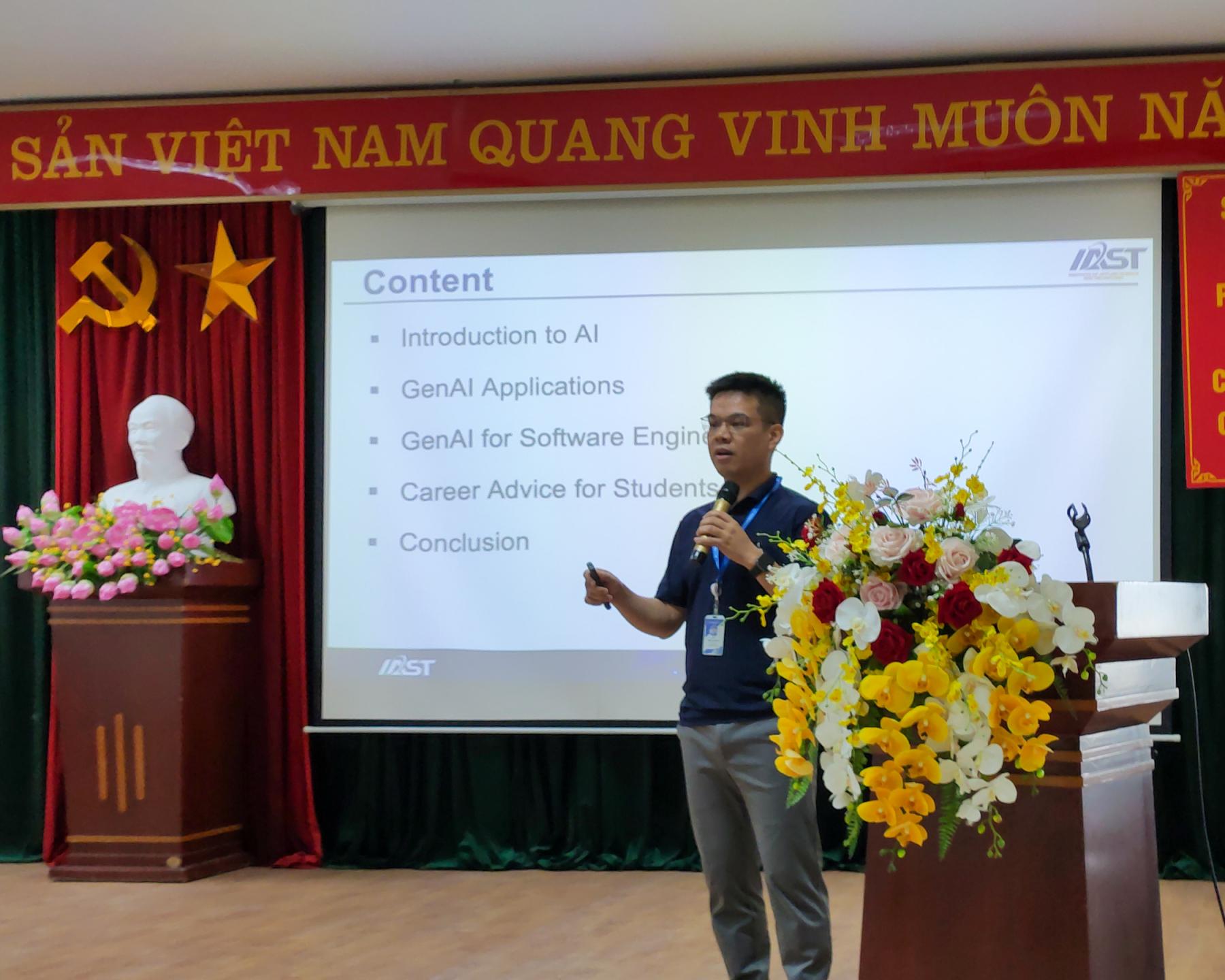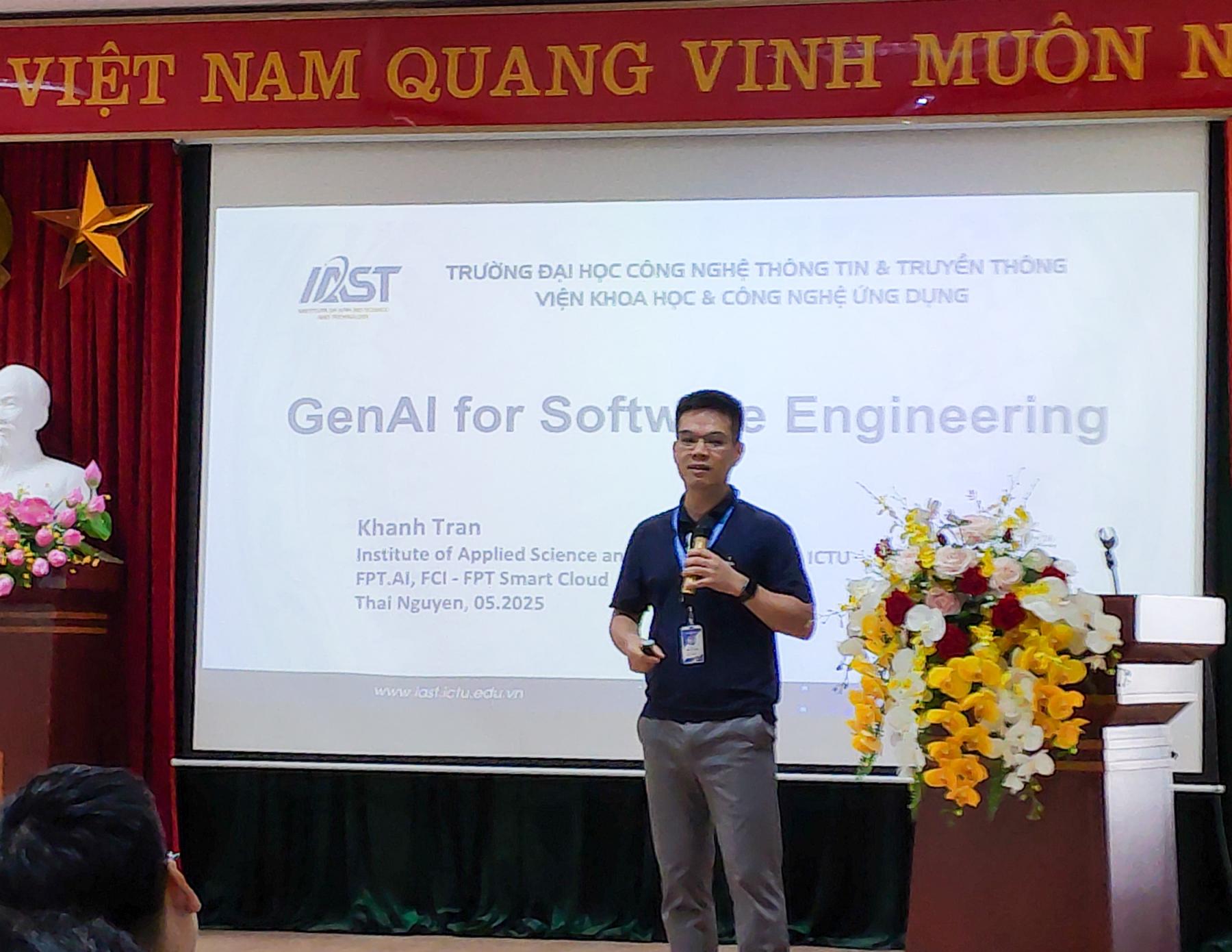 Buổi chia sẻ không chỉ cung cấp kiến thức nền tảng về GenAI, mà còn nhấn mạnh vai trò, tiềm năng ứng dụng và cơ hội nghề nghiệp trong lĩnh vực này, đặc biệt với các bạn trẻ bắt đầu hành trình học tập và nghiên cứu trong ngành kỹ thuật phần mềm.