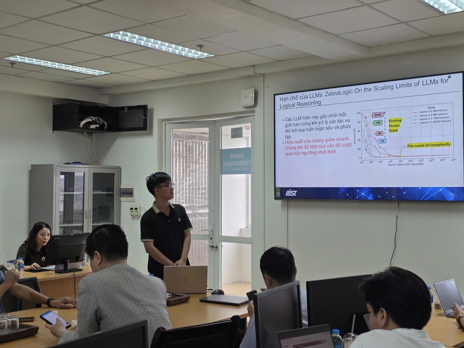 Tại seminar, TS. Trần Văn Khánh – Phó Viện trưởng Viện Khoa Học và Công Nghệ Ứng Dụng cùng sinh viên nghiên cứu Nguyễn Kế Lương đã trình bày công trình “Unlocking Legal Logic: Enhancing Legal Textual Entailment with Structured Prompt”. Nghiên cứu đề xuất quy trình tối ưu Structured Prompt cho các mô hình ngôn ngữ lớn (LLMs), giải quyết thách thức về mô phỏng lập luận tuần tự và bảo toàn ý nghĩa pháp lý trong xử lý Legal Textual Entailment (LTER). Kết quả thực nghiệm cho thấy mô hình đạt hiệu quả vượt trội trên hai bộ dữ liệu benchmark, hứa hẹn ứng dụng thiết thực trong tra cứu và dẫn chứng pháp lý bằng AI.